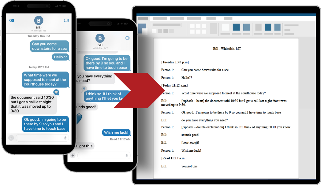 If you have text messages that you want to preserve in a document, just screenshot the texts and upload them to our app. You’ll get a complete transcript back within a few hours.